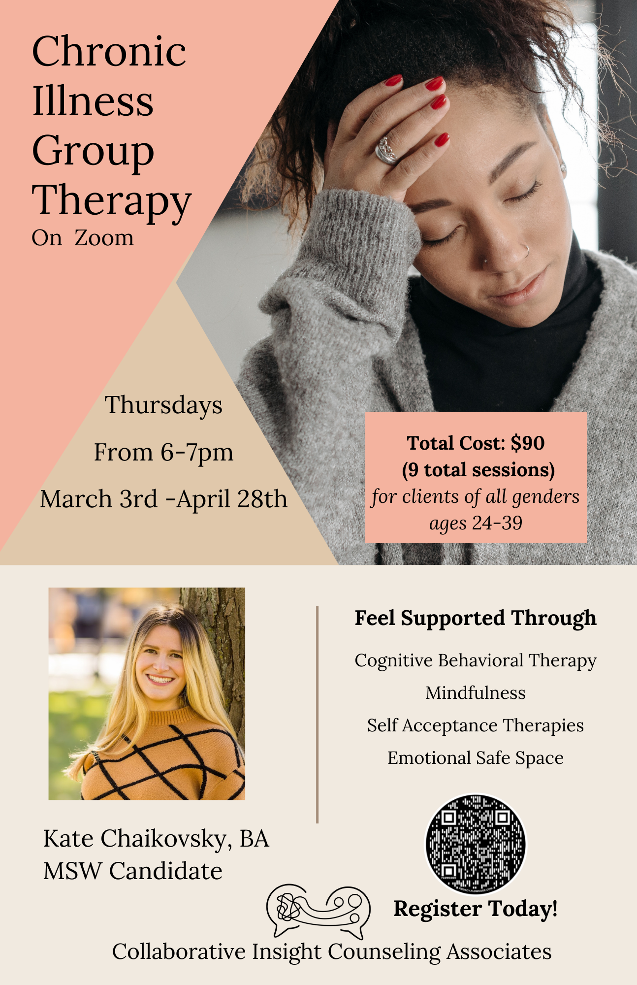 This group will meet for nine sessions and is for anyone between the ages of 24 and 39 who is looking for support in managing their own chronic illness.